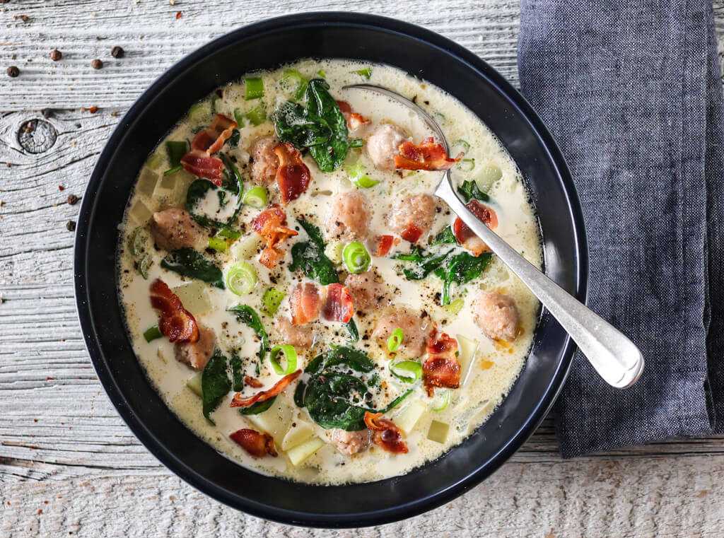 Når vinterkulden kommer smygende og du lengter etter noe som varmer både kropp og sjel, er denne kremete suppen med poteter, kjøttboller, sprøstekt bacon, spinat og frisk vårløk akkurat det du trenger. Kjapp og enkel å lage, men rik på smak – en skikkelig hverdagsfavoritt som du gjerne lager igjen og igjen. Server suppen med godt brød, gjerne noe med litt skorpe som kan dyppes i den kremete kraften.