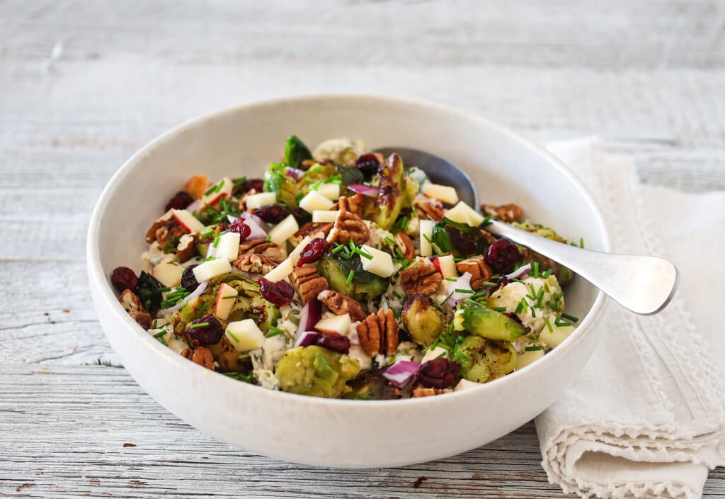 I denne kremede rosenkålsalaten møter lun rosenkål blant annet friskt eple, søte tranebær og sprø pekannøtter. Salaten er nydelig og fargerikt tilbehør til alt fra røkt skinke og ribbe til kalkun og kylling – og passer helt perfekt til julematen.