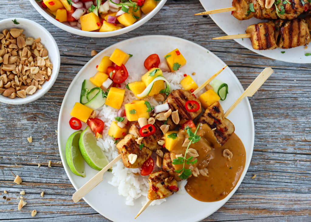Kylling satay er en populær og smakfull kyllingrett inspirert av det malaysiske kjøkkenet. Den serveres her sammen med en kremet og sterkt krydret peanøttsaus og en forfriskende mangosalat, og sammen skaper de en fin balanse av søtt, salt og litt spicy.