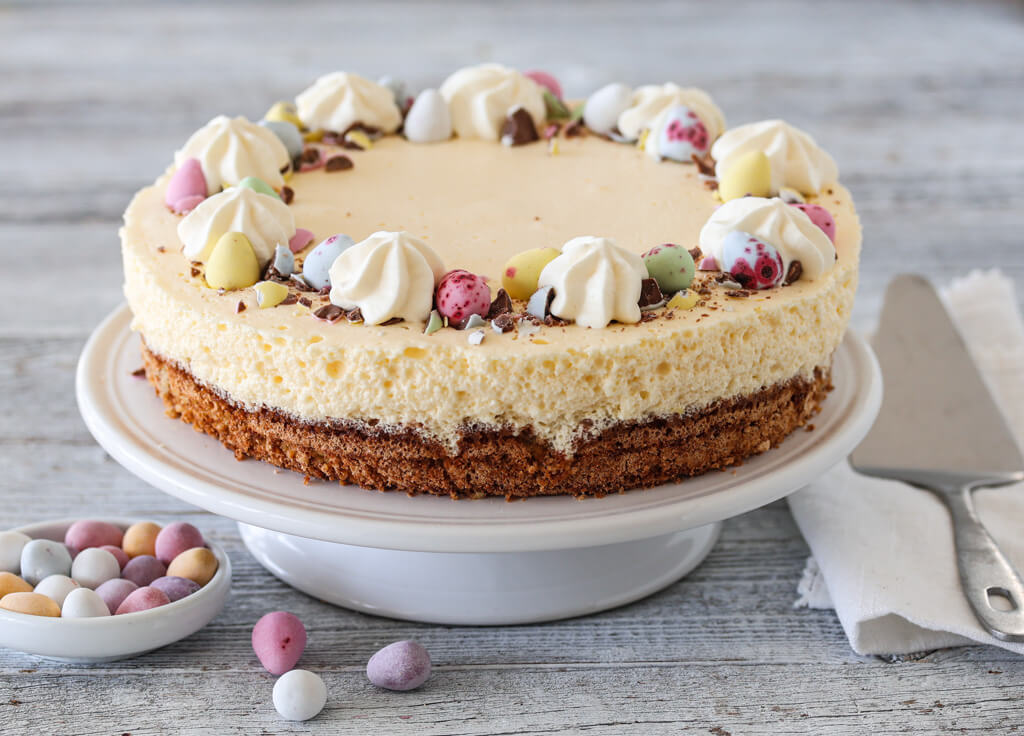 En myk mandelbunn toppet med frisk sitronfromasj og pyntet med små sjokoladeegg er en perfekt kombo av syrlig, søtt og sprøtt. Denne lekre dessertkaken passer spesielt godt til påske, eller når du ellers vil servere noe friskt etter et godt måltid. Den luftige sitronfromasjen legger seg som et mykt lag over den nøtteaktige bunnen, mens sjokoladeeggene gir tekstur og et lite hint av sødme og fest. Prøv den du også!