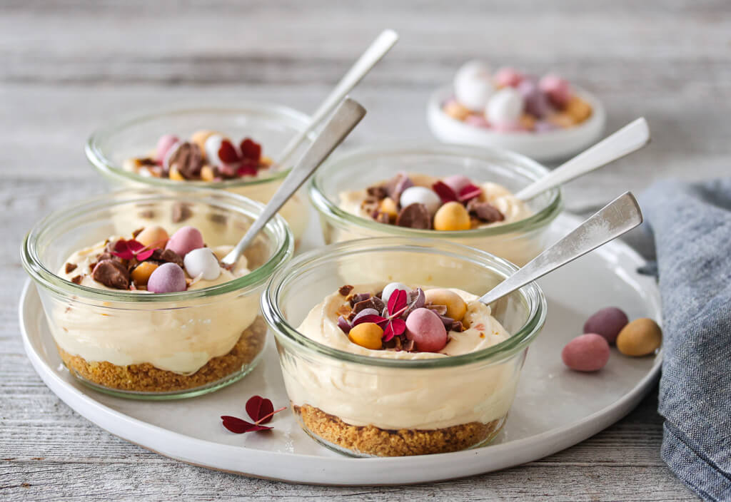 Ostekake i glass er en enkel, frisk og fristende dessert som passer perfekt i påsken. Glasset fylles med søte kjekssmuler med et hint av sitron, og toppes deretter med en silkemyk, fyldig pasjonsfruktkrem. Det hele dekoreres med små, fargerike sjokoladepåskeegg som gjør at den både ser vakker ut, men også tilfører en deilig smak og tekstur.