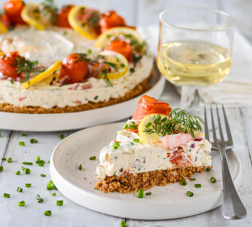 Ønsker du å imponere gjestene med noe friskt, lekkert og litt annerledes? Da er denne salte «ostekaken» midt i blinken! Med en bunn av usøtede havrekjeks og et fyldig fyll av kremost, crème fraîche, røkelaks og reker, er dette en smaksrik forrett eller smårett som passer perfekt på sommerens festbord – enten det er 17. mai, grillfest eller sommerfest. Den passer også perfekt på et koldtbord eller som del av en buffet. «Ostekaken» toppes med røkt laks, reker, sitron, dill og gressløk for en frisk avslutning, og det beste av alt: den er enkel å lage, kan forberedes dagen i forveien – og ser dessuten helt fantastisk ut på fatet!