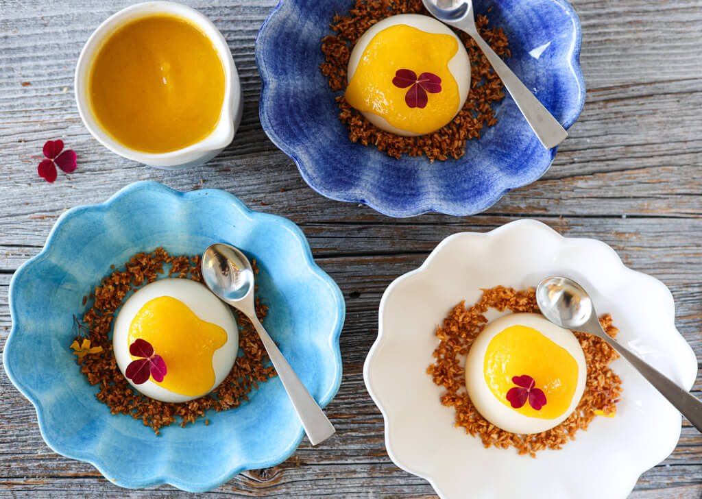 Denne silkemyke og kremede panna cottaen med kokosmelk er en frisk og eksotisk vri på den klassiske italienske desserten. Den serveres med sprø kokoskrønsj og en solgul mangosaus. Du kan lage den i glass for en enkel og rustikk servering, eller bruke silikonformer hvis du ønsker å imponere med en litt mer elegant presentasjon. Desserten kan enkelt varieres med ulike typer saus – se tips helt til slutt.