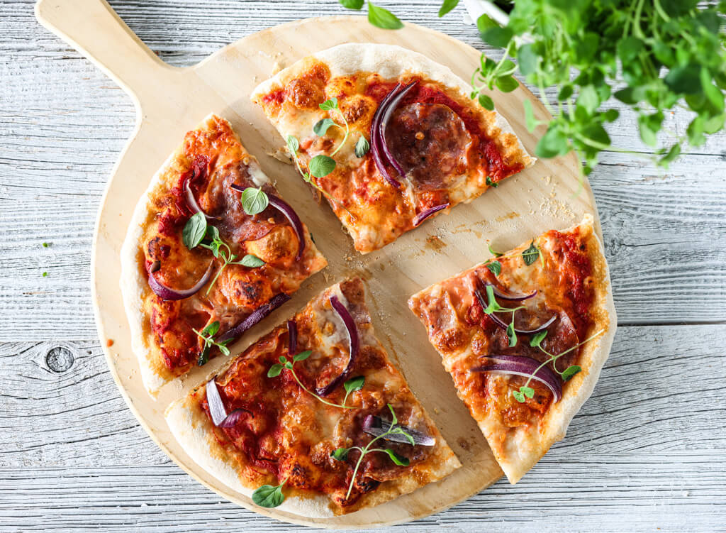 Det er få ting som slår duften av nystekt pizza rett fra ovnen – spesielt når den er laget helt fra bunnen av med gode råvarer. Her toppes pizzabunnen med Mutti Aromatica pizzasaus, og deretter mozzarella, tynne skiver av salami fra en norsk lokalmatprodusent, rødløk og et dryss frisk oregano etter steking. Resultatet er en pizza som smaker ekte italiensk, men med en liten nordisk vri – perfekt for helgekosen eller når du vil imponere gjestene.