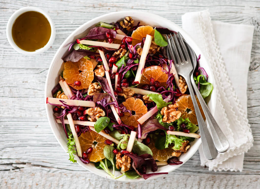 Dette er en frisk og sprø salat med rødkål, småbladsalat, klementiner, epler, valnøtter og granateplekjerner. Den er lett å lage, full av gode smaker, og er godt tilbehør til for eksempel kylling, kalkun, svin og vilt – eller som et friskt innslag på buffeten.