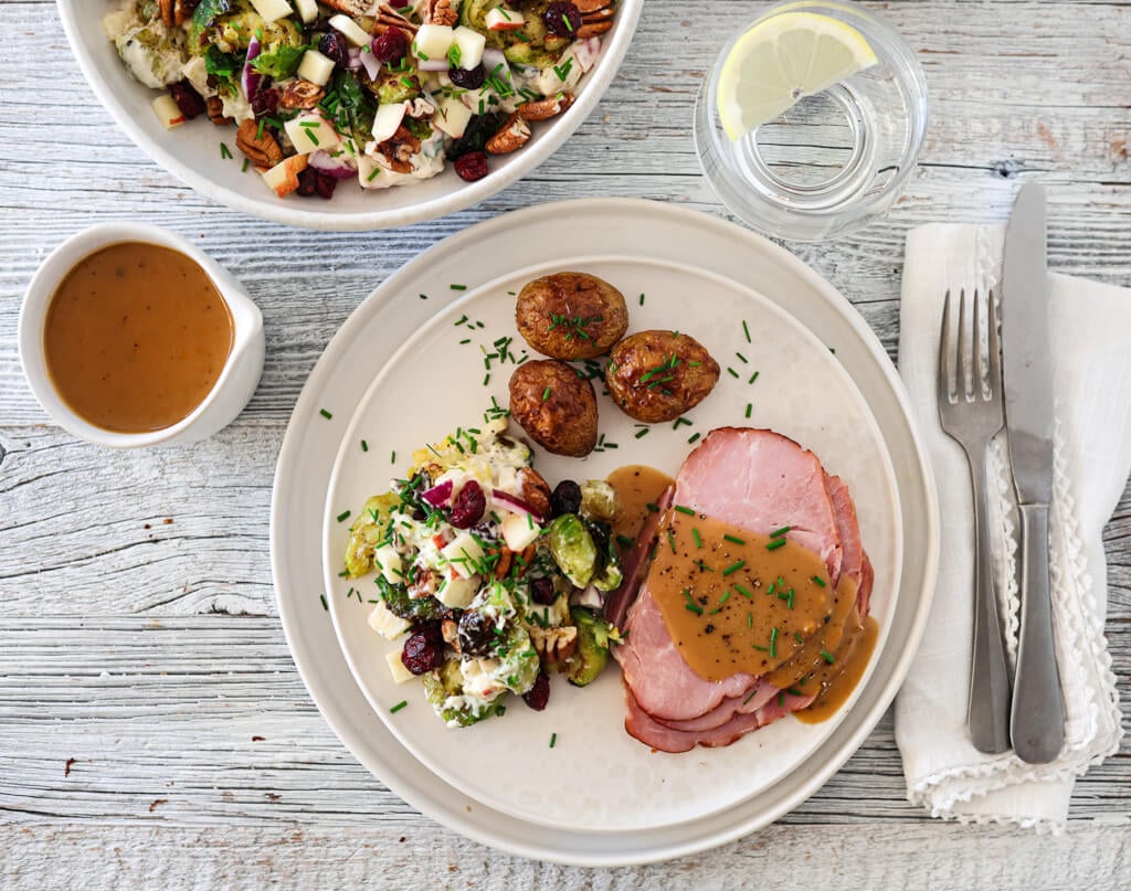 Røkt juleskinke er en klassiker som alltid smaker godt, og her får den følge av en frisk appelsinsaus, sprø poteter og en lun, kremet rosenkålsalat. Resultatet er en smakfull førjuls- eller romjulsmiddag – eller en ekstra god helgerett i vintermånedene. Velbekomme!