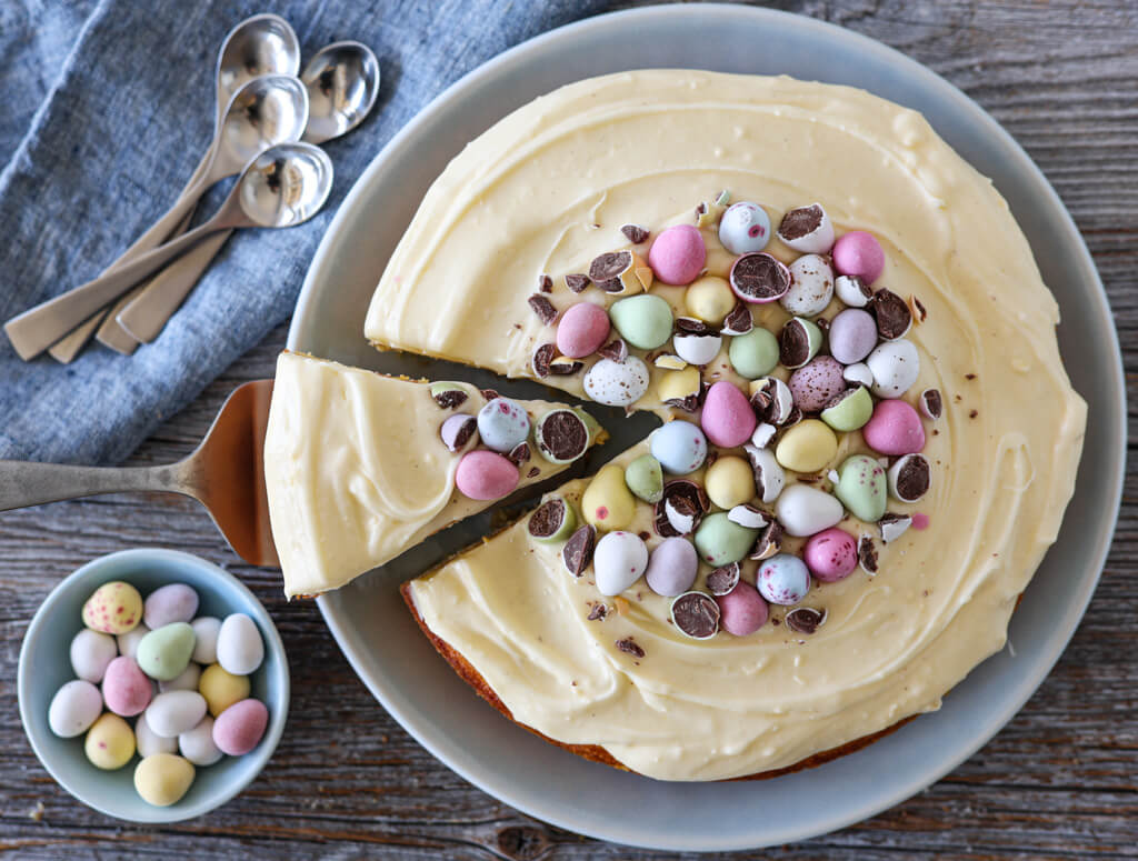 Denne saftige og enkle appelsinkaken er selve definisjonen på påskekos! Med frisk smak av appelsin, fløyelsmyk ostekrem med et hint av appelsin - og et fristende dryss av små, fargerike sjokoladeegg på toppen, blir den garantert en favoritt rundt påskebordet. Kaken dynkes med appelsinjuice rett etter steking, noe som gjør den ekstra saftig og smakfull. Prøv den du også!