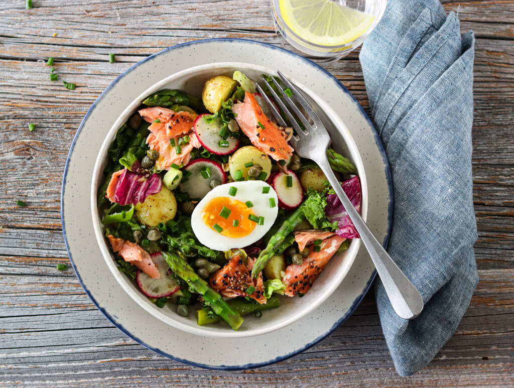 Lag en mettende salat med blant annet varmrøkt laks, poteter, asparges, reddiker og egg. Det hele toppes med min populære sennepsvinaigrette med et hint av sitron. Prøv denne deilige sommersalaten du også!