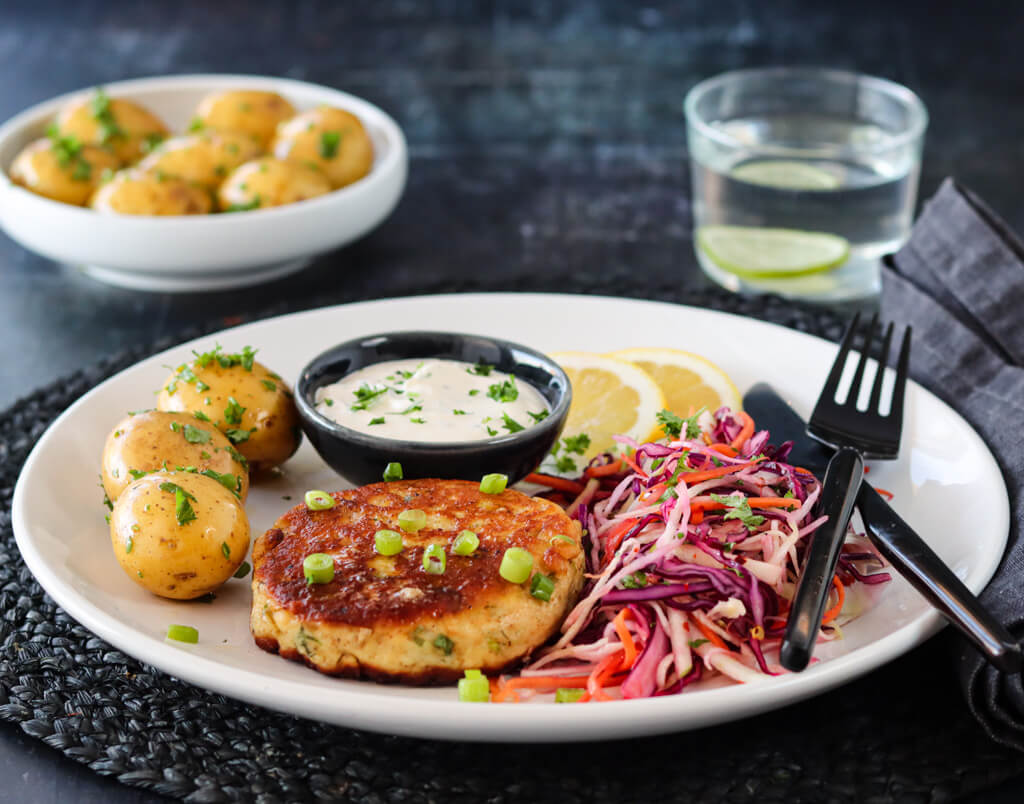 Hjemmelagde seikaker vekker mange gode barndomsminner. Disse er smaksatt med vårløk, dill og sitronsaft, og serveres med en frisk råkostsalat og en deilig urtekrem. En herlig, sunn og smakfull måte å nyte et godt fiskemåltid på, samtidig som du tar vare på gode matminner fra barndommen.