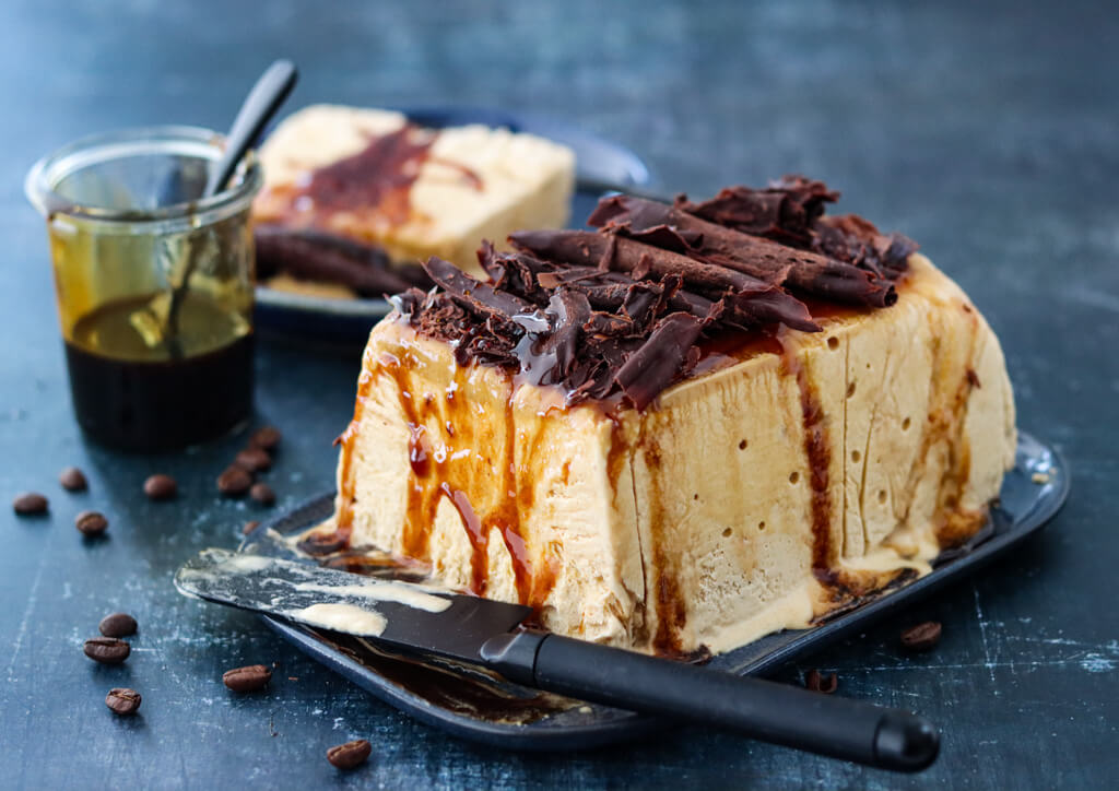 Semifreddo betyr halv-frossen og er en italiensk dessert – en deilig iskrem du kan lage uten iskremmaskin. Jeg har her smaksatt den med kaffe og kaffelikør og serverer den med en deilig kaffesirup og revet mørk sjokolade.