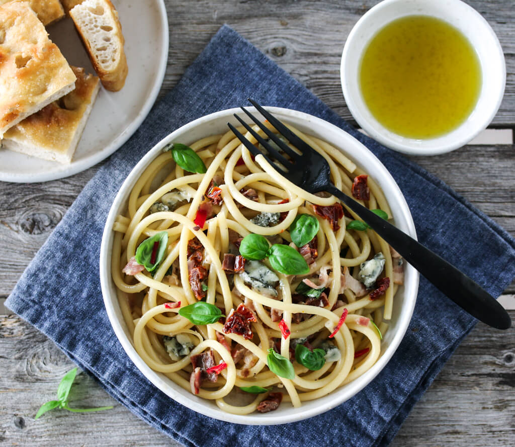 Det er ingen hemmelighet at junior på 10 år eeeelsker pasta, og synes at nå var det jammen på tide med en ny pastarett på bloggen (hehe, han begynner å skjønne hvordan det henger sammen nå). Jeg benyttet derfor anledningen til å ta en liten makeover på et mer enn 8 år gammelt blogginnlegg, som nå går inn i pensjonistenes rekker. Her får pastaen selskap av bacon, soltørket tomat, en smakfull fløtesaus og ikke minst deilig gorgonzola - prøv det du også!