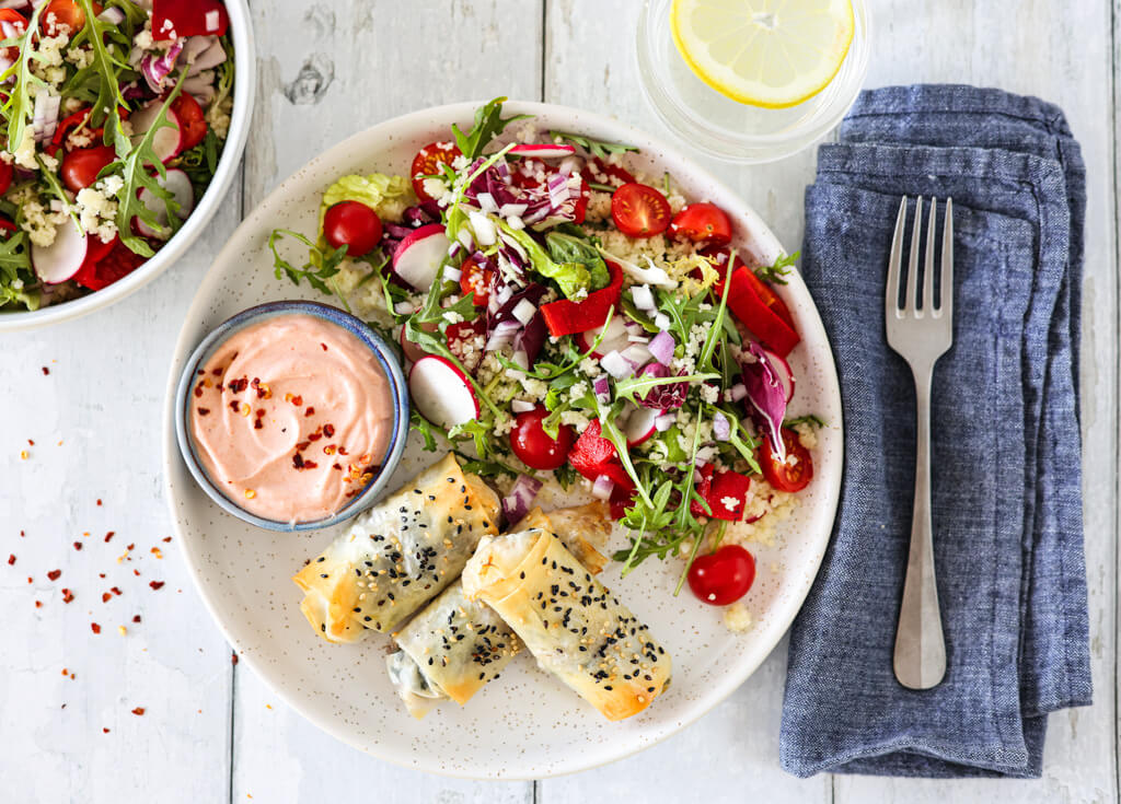 Er du klar for en fargerik og smakfull vegetarmiddag? Her kan jeg friste med sprø og saftige spinat- og fetaruller, servert sammen med en fargerik couscoussalat med blant annet småbladsalat, grillet paprika og søte tomater. Ved siden av serveres en silkemyk tomatdipp som binder det hele sammen. Dette er maten du både har lyst til å lage – og spise, igjen og igjen.