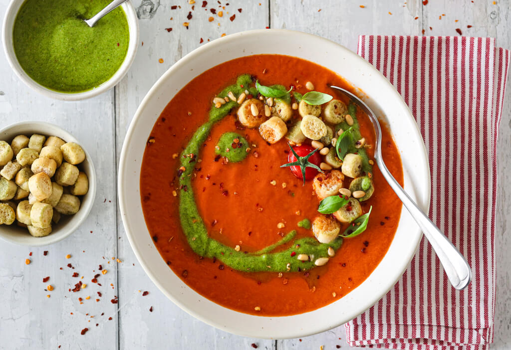 Server suppen rykende varm, toppet med basilikumpesto, krutonger, ristede pinjekjerner, en klype chiliflak og frisk basilikum. Velbekomme!
