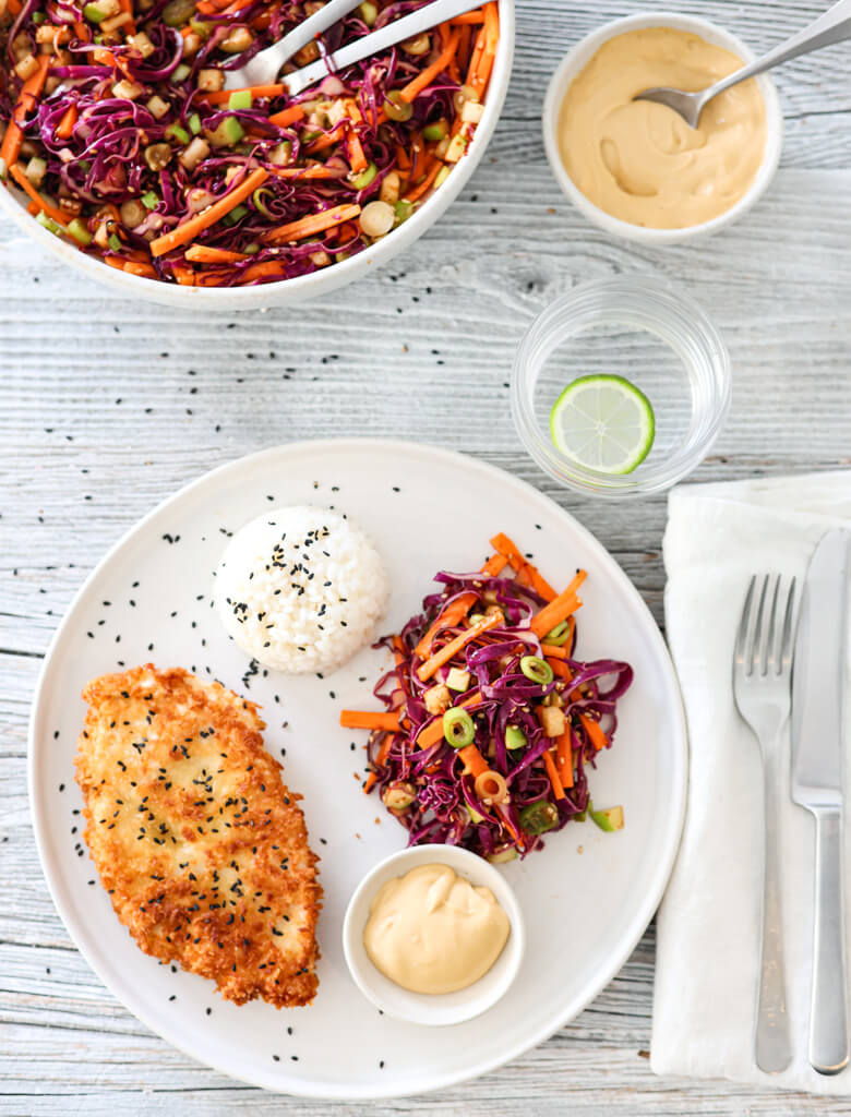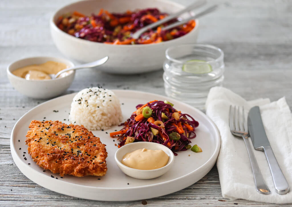 Sprø, saftig og full av smak – torikatsu er Japans svar på comfort food! Denne klassikeren består av saftig kyllingfilet som paneres i panko og stekes gyllen og sprø, servert med en kremet soyamajones, frisk og sprø asiatisk kålsalat og nykokt ris.