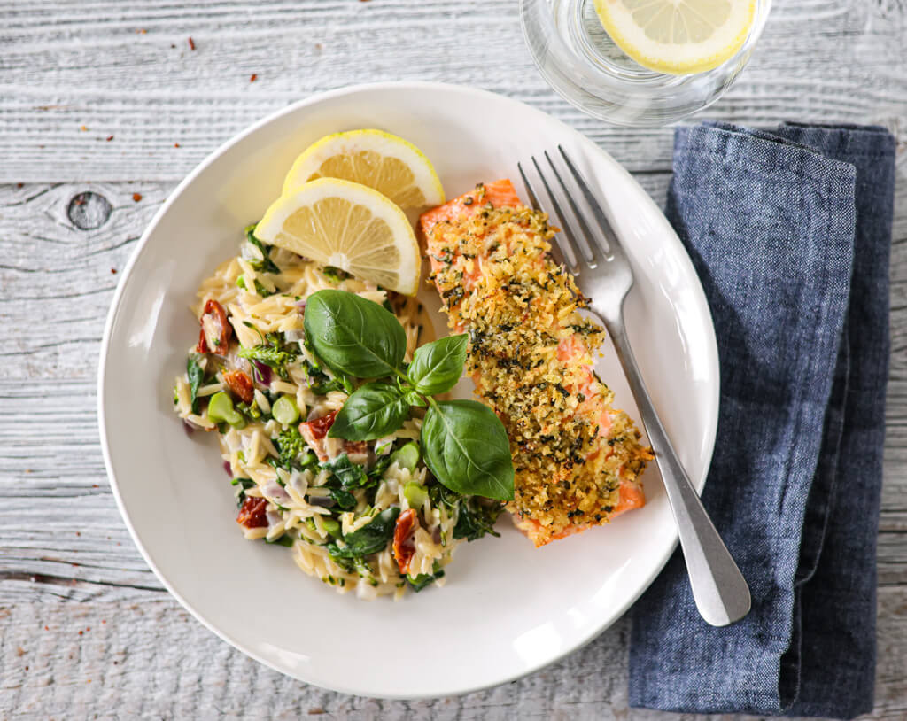 I dag kan jeg friste med urtebakt laks med kremet risoni og grønnsaker – en frisk og smakfull rett som passer like godt til hverdags som til helgekosen. Den saftige laksen får et sprøtt og aromatisk lokk av panko, basilikum, parmesan og sitronskall, som gir deilig smak og tekstur. Sammen med kremet risoni blandet med sprø brokkolinibiter, soltørkede tomater, rødløk og spinat, blir dette en komplett og innbydende middagsrett full av farger, deilig tekstur og gode smaker.