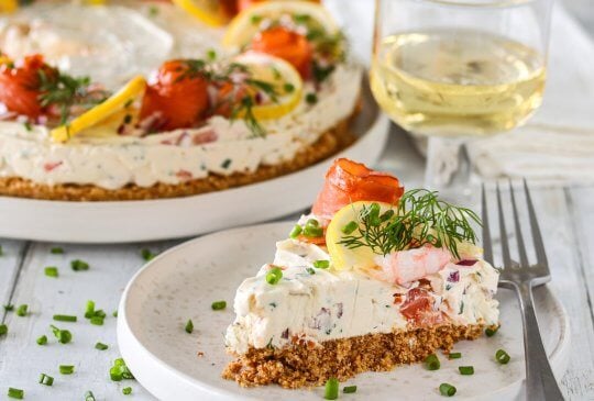 «OSTEKAKE» MED RØKT LAKS OG REKER