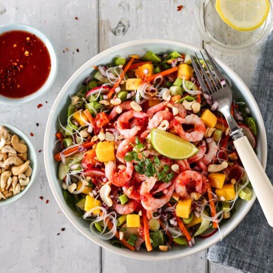FARGERIK NUDELSALAT MED REKER, MANGO OG SPICY TOMATDRESSING
