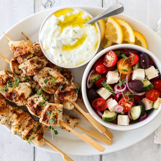 KYLLING SOUVLAKI MED TZATZIKI OG GRESK SALAT